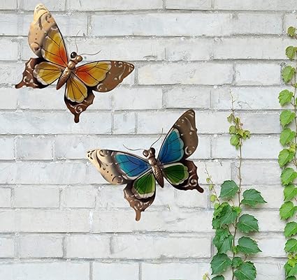 Starbluegarden 2pcs Set Garden Decor Butterfly Patio Wall Decoration Metal Glass Sculpture Indoor Outdoor Wall Art